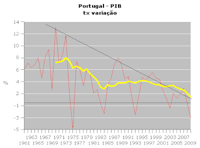 O gráfico mostra - linha encarnada - a taxa de variação do Produto Interno Bruto português entre 1961 e 2009. A linha amarela representa a média móvel de 10 anos da taxa de variação do PIB ou, traduzindo, dá uma aproximação à taxa de crescimento potencial da economia. Há ainda a recta a negro que liga os anos de picos de crescimento ou, traduzindo, a taxa máxima que se pode esperar atingir num determinado ano.